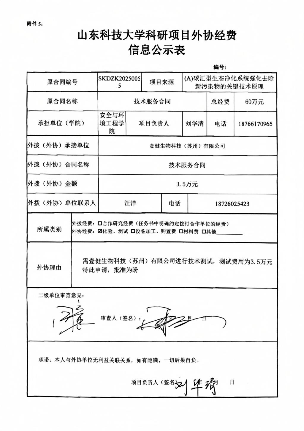 根据《山东省人民政府办公厅印发关于进一步完善财政科研项目资金管理的若干措施的通知》(鲁政办字(2019)120号)以及《山东科技大学科研项目与经费管理办法(试行)》(山科大发 〔2020)64号〕相关规定,现对刘华清为项目负责人的(A)碳汇型生态净化系统强化去除新污染物的关键技术原理项目的外协经费情况进行公示,公示时间为2025年10月15日~2025年10月22日(公示时间不少于5个工作日)。若对本项外协经费有异议,请于公示期内向91猫先生 或科技处反映并提交书面材料。