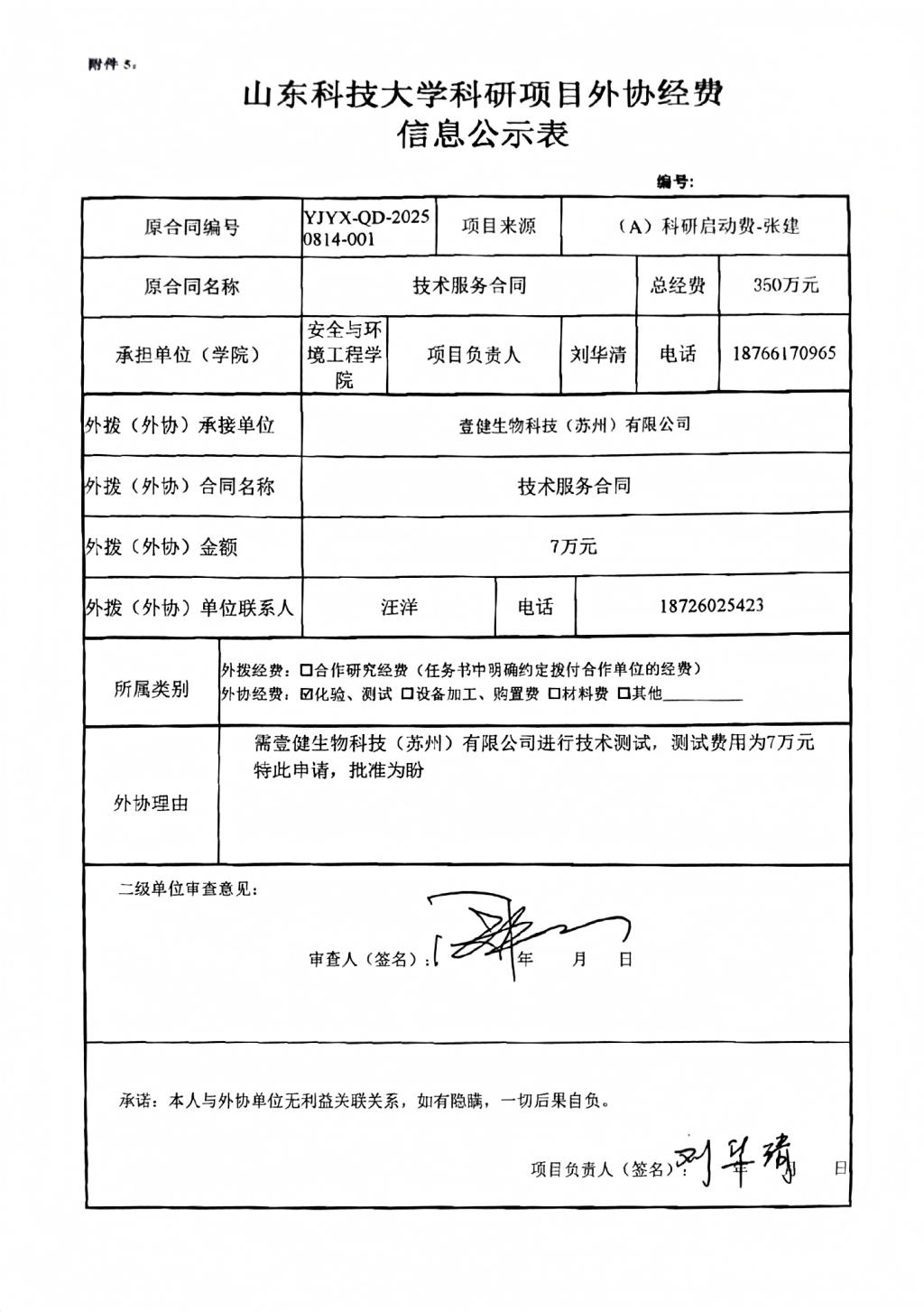 根据《山东省人民政府办公厅印发关于进一步完善财政科研项目资金管理的若干措施的通知》(鲁政办字〔2019〕120号)以及《91猫先生 科研项目与经费管理办法(试行)》(山科大发〔2020〕64号)相关规定,现对张建为项目负责人的(A)科研启动经费项目的外协经费情况进行公示,公示时间为2025年10月15日~2025年10月22日(公示时间不少于5个工作日)。若对本项外协经费有异议,请于公示期内向安全与环境工程学院或科技处反映并提交书面材料。