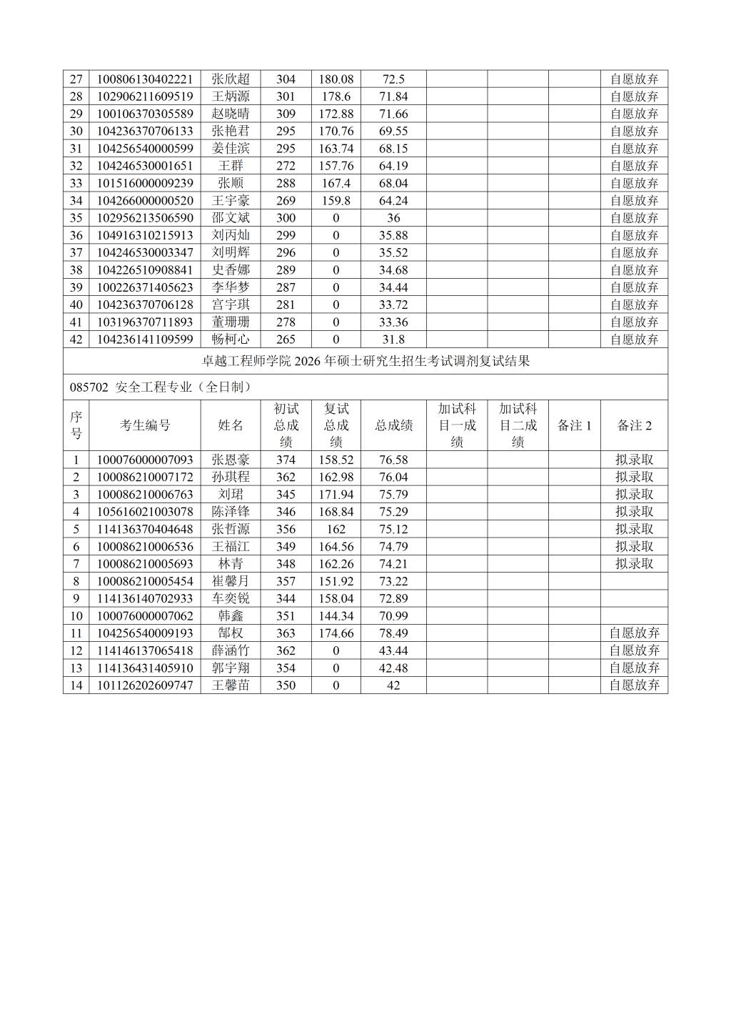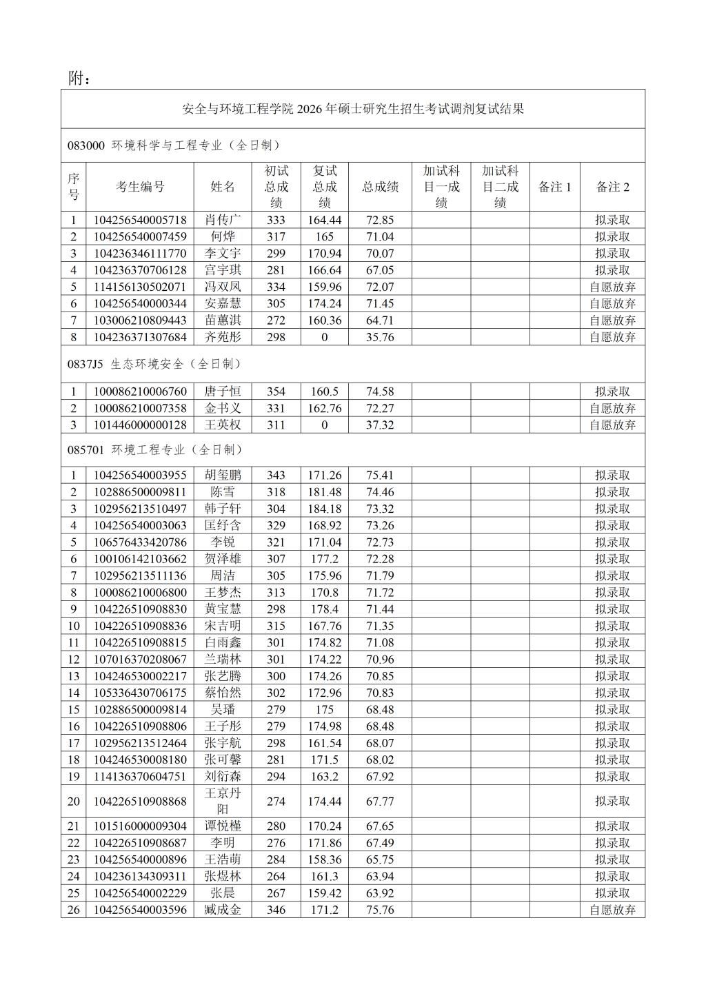 我院按照学校下达招生计划进行拟录取,若后期学校追加计划或公示名单中拟录取考生自愿放弃,将按照总成绩从高到低顺次进行待录取,并另行公示。最终拟录取名单由学校研究生院进行统一公示。