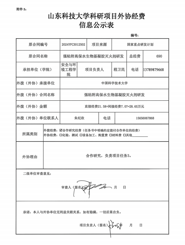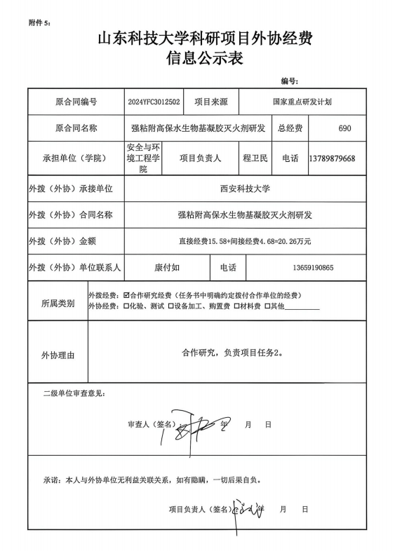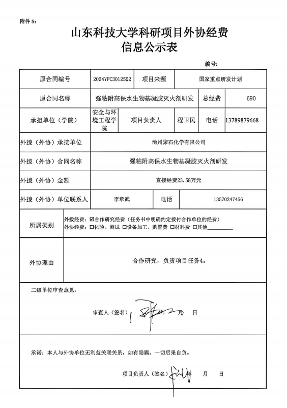 根据《山东省人民政府办公厅印发关于进一步完善财政科研项目资金管理的若干措施的通知》(鲁政办字〔2019〕120号)以及《91猫先生 科研项目与经费管理办法(试行)》(山科大发〔2020〕64号)相关规定,现对程卫民为项目负责人的强粘附高保水生物基凝胶灭火剂研发项目的外协经费情况进行公示,公示时间为 2026年4月20日~2026年4月24日(公示时间不少于5个工作日)。若对本项外协经费有异议,请于公示期内向91猫先生 或科技处反映并提交书面材料。