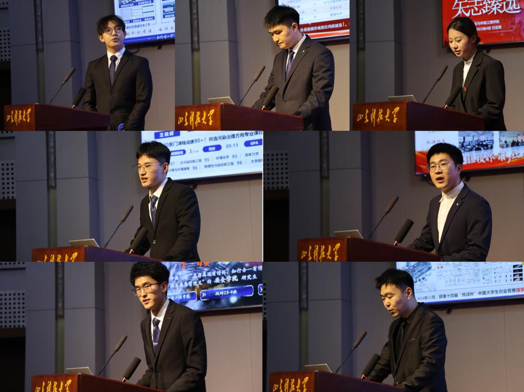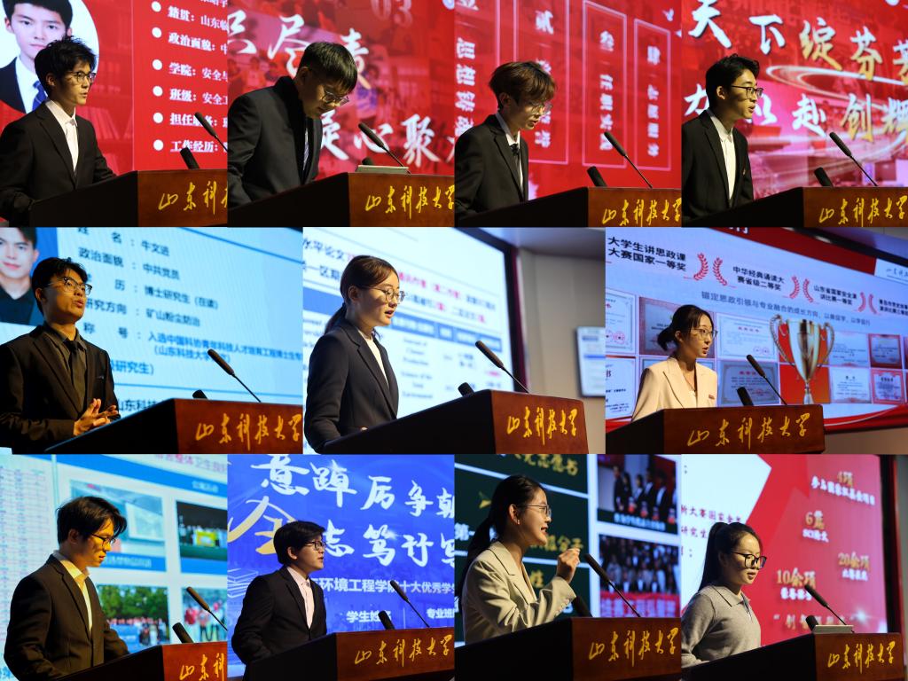 十九位候选人依次上台,进行风采展示与陈述。他们以扎实的成绩、丰富的经历、深刻的感悟,讲述了各自在思想追求、专业学习、科研探索、社会实践、学生工作等方面的成长故事。来自博研2022级的牛文进主动将学术研究融入国家战略,凭借在粉尘源头防控领域的突出成果引来全场喝彩;硕研2023-3班的崔凌南则讲述了自己6年来从“追逐光”到“发散光”的成长与蜕变;环境工程2022-4班的王晓辉分享了自己投身科技创新竞赛的拼搏历程,展现了卓越的创新与实践能力;来自安全工程2023-5班的郭忠菲则结合自身优异的学业成绩与出色的实践经历进行汇报,条理清晰的讲述赢得了评委们的阵阵掌声;来自2024级安全工程专业的郑琪和薄杰也向在场的老师与同学们展示了入校一年以来的收获与成长。每一位候选人的陈述都饱含热情、各具特色,充分展现了安全学子笃学力行、全面发展的精神风貌与昂扬向上的时代风采。