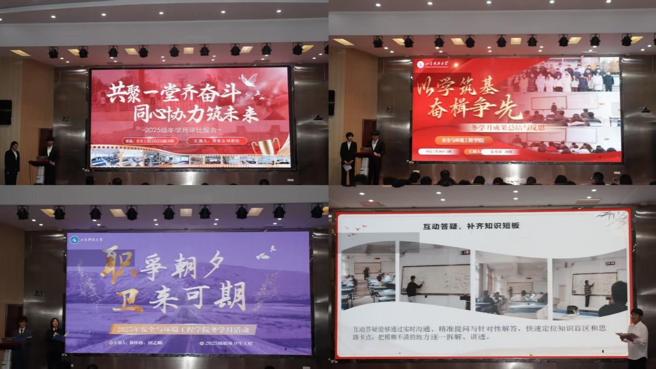 本科生2025级各班班长和团支部书记通过PPT汇报形式,从班级学风理念、学习方法总结、学风营造成果、量化成绩分析及班级成长感悟等多个维度,全方位回顾了“冬学月”期间的所学、所思、所获。各班级列数据、亮指标、强对比、重谋划,汇报内容翔实、亮点纷呈,充分展现了安全学子勤奋进取、勇于探索的精神风貌和专业素养。